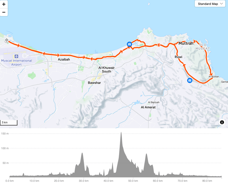 This is a classic Easy ride. Starting from The Wave Muscat to Mutrah and back. The one big climb can be avoided if required.